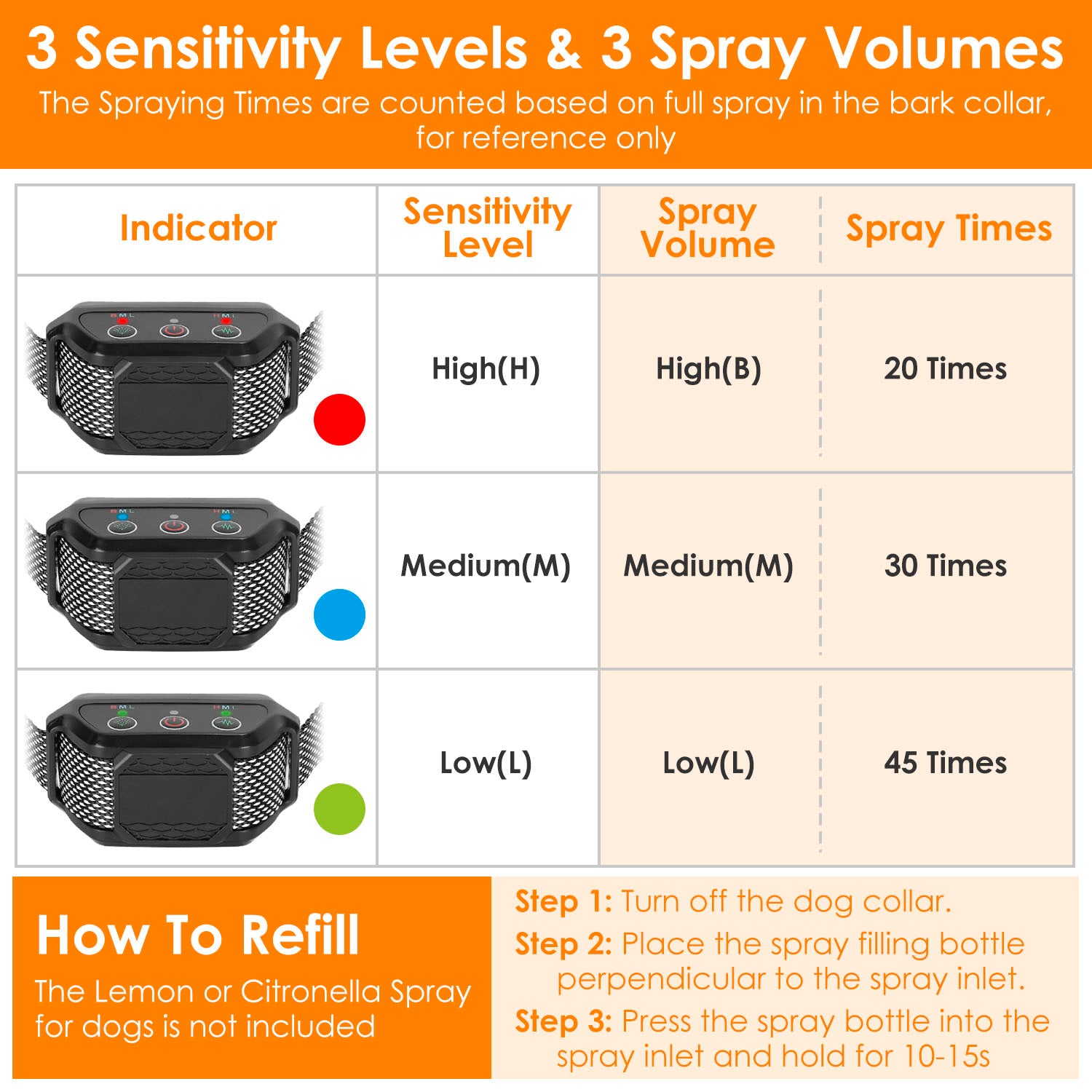 This citronella bark collar features 3 sensitivity levels and 3 spray volumes, suitable for dogs of all sizes. You can choose the most suitable combination of sensitivity and spray volume for your furry friend.